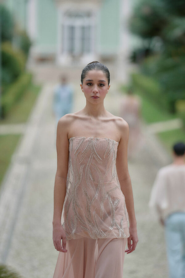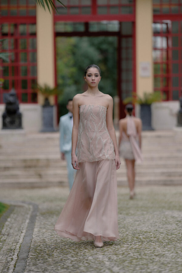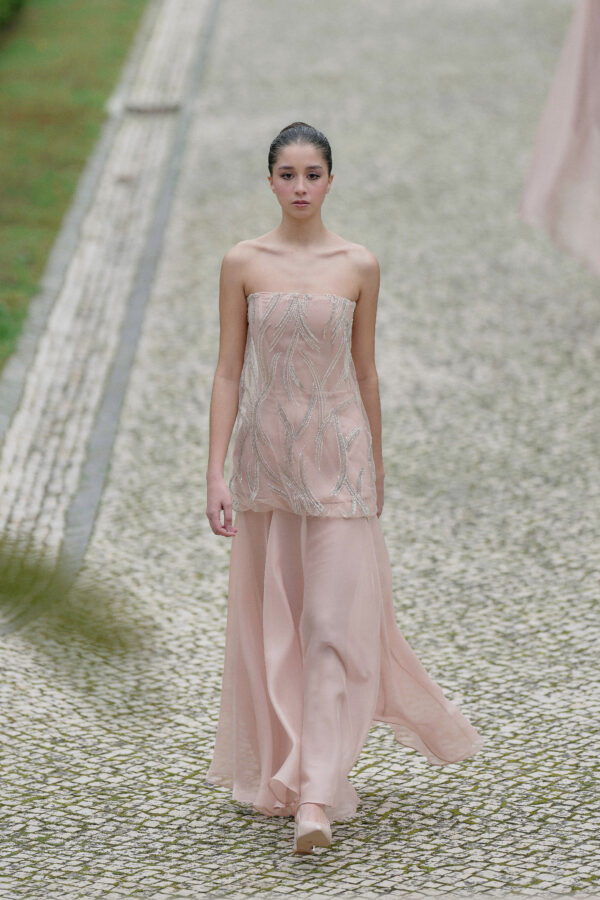 Vestido Cristal une a leveza da organza ao esplendor subtil da pedraria pregada manualmente, criando uma silhueta delicada e romântica. O detalhe de bojo acrescenta dimensão e movimento, detalhe de varetas no interior para um melhor suporte e conforto.