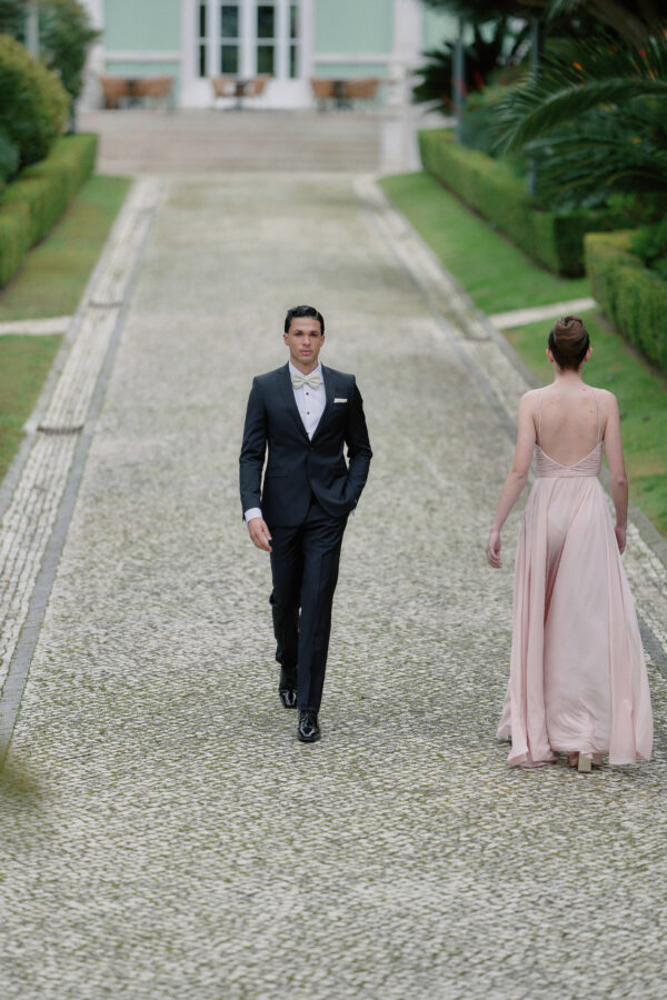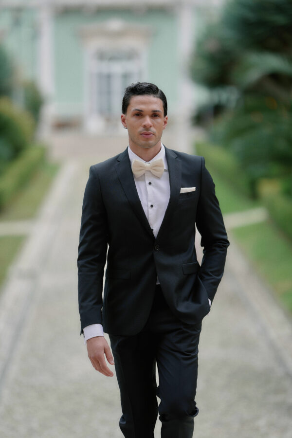 Este fato de cerimónia em preto clássico apresenta um corte Slim Fit, pensado para realçar a silhueta masculina com sofisticação e modernidade. O casaco distingue-se pela lapela com fila de cetim, que confere um toque de elegância extra, ideal para eventos formais. Conta ainda com bolso de lenço e bolsos com vivos e pala, que acrescentam detalhe ao design. O fecho com um único botão proporciona um visual limpo e requintado. A completar o conjunto, uma calça clássica de corte reto que garante um look harmonioso e intemporal.