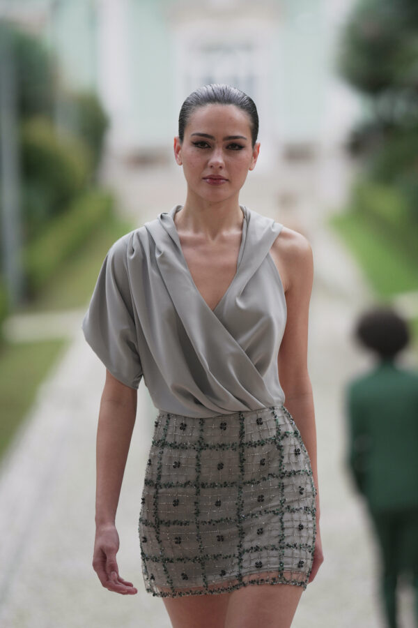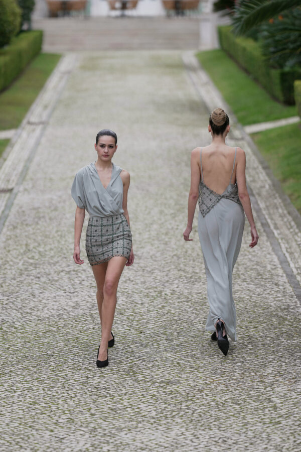 Com um corte curto e assimétrico, este modelo destaca-se pelas costas abertas e pelo inesperado detalhe de capuz, conferindo-lhe uma atitude moderna e irreverente. A fusão de tecidos — crepe estruturado e pedraria — resulta num jogo de contrastes que capta o olhar e exala originalidade.