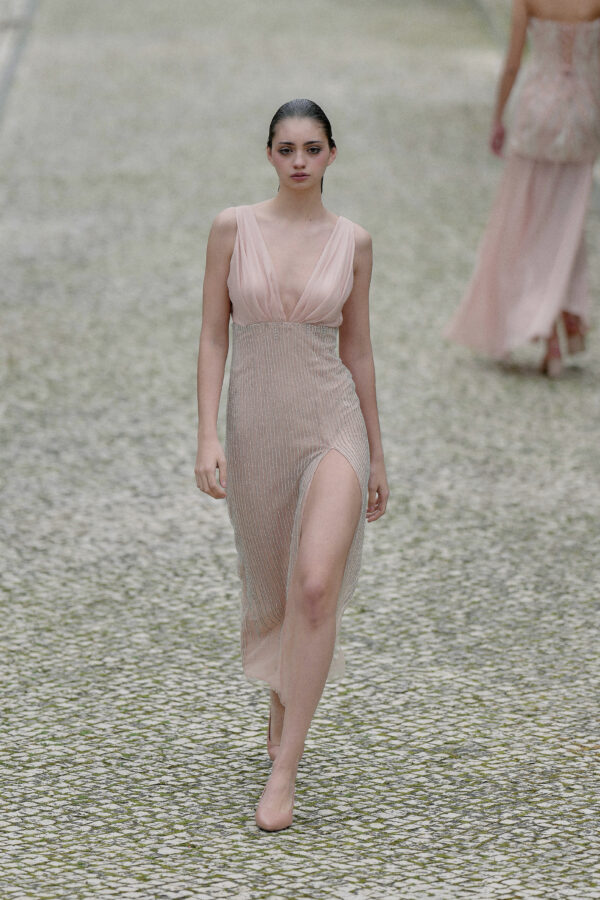 Este vestido midi em organza leve abraça a silhueta com um drapeado requintado no peito, realçado por um delicado encaixe de pedraria Swarovski que capta a luz com subtileza. A racha lateral confere-lhe uma sensualidade discreta, contrastando com o romantismo da peça.