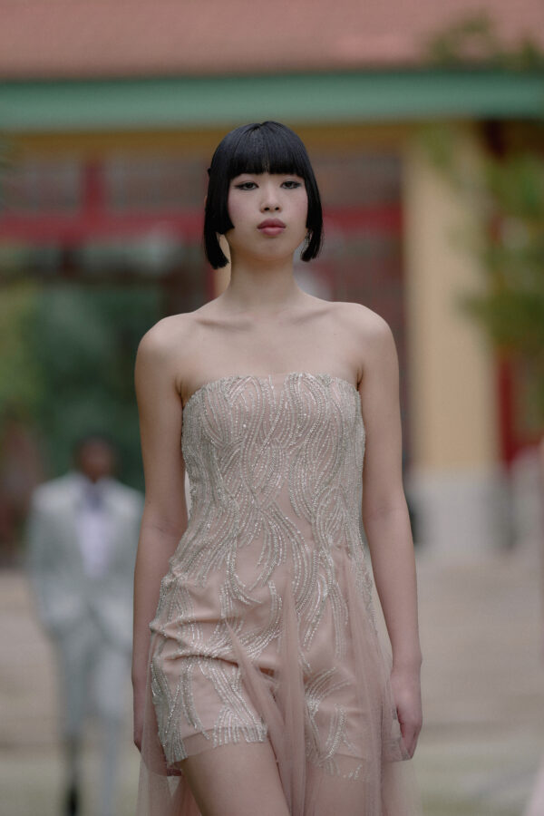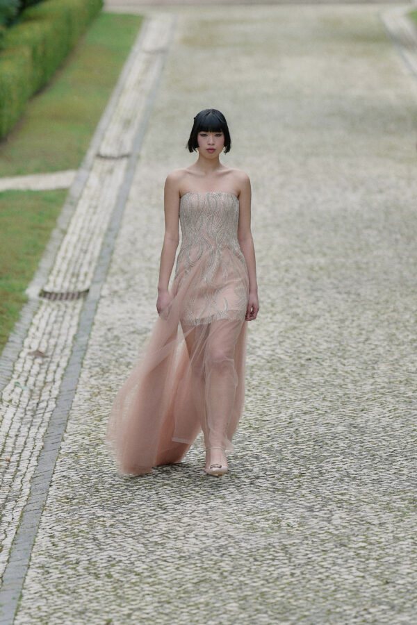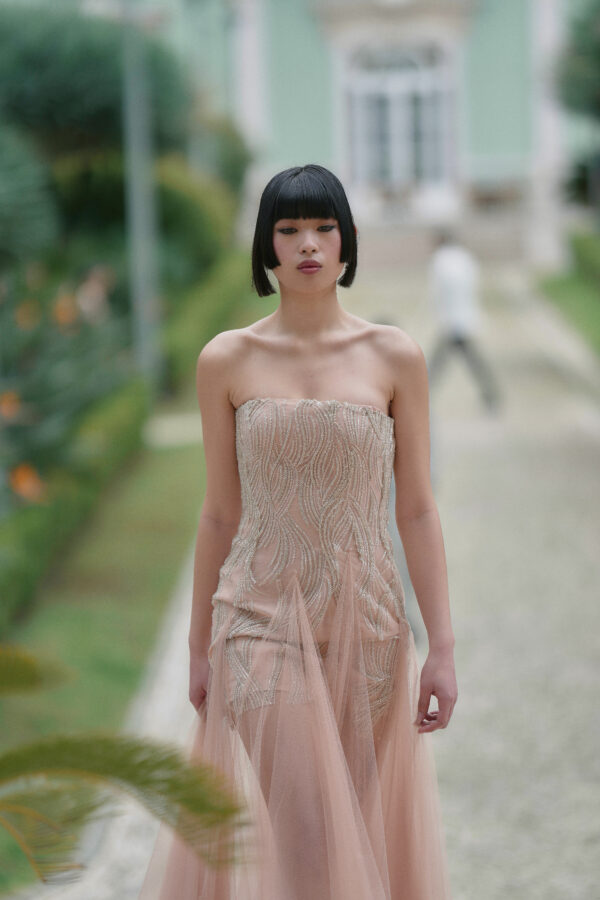 Misturando tule delicado e pedraria cintilante, este vestido comprido é uma obra de arte com sua estrutura interna de vestido curto, que confere elegância e definição. O tule, aplicado manualmente, cria um volume etéreo e leveza, resultando numa peça que capta a luz a cada movimento.