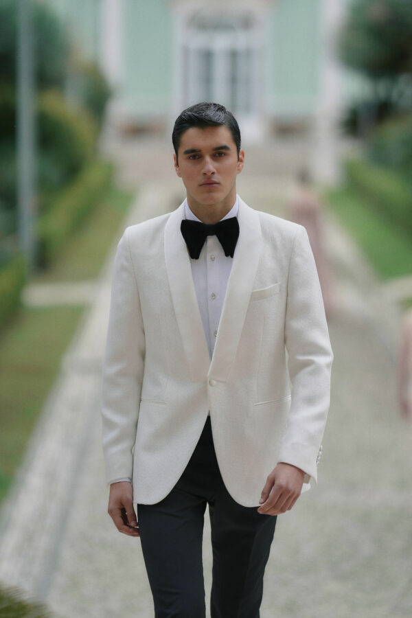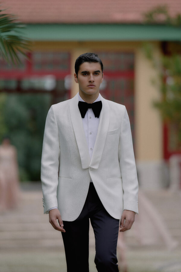 Clássico, imponente e com presença inesquecível, o fato Regale foi criado para cerimónias onde o detalhe faz toda a diferença. O casaco em branco nacarado apresenta corte Slim Fit e é enriquecido por uma lapela em paralelo de textura suave, que se destaca com discrição e requinte. O fecho com botão forrado, os bolsos com vivos e pala e o bolso de lenço acentuam a estética limpa e refinada. A calça em tom escuro cria um contraste elegante e moderno, com duas tiras de aperto e ajustadores laterais para conforto e precisão. Os bolsos hexagonais com pala acrescentam um toque subtil de design contemporâneo a um conjunto que respeita o protocolo sem abrir mão da originalidade.