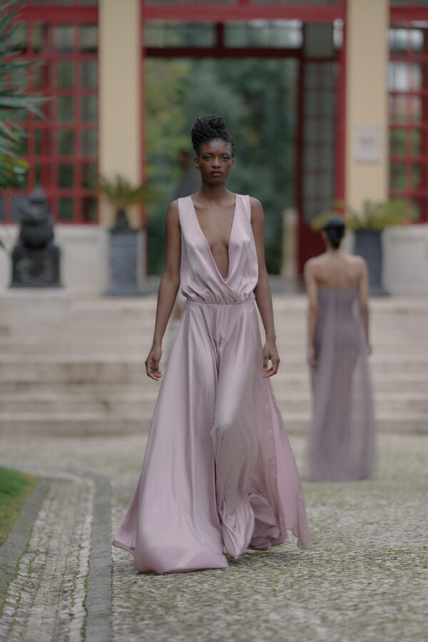 Com um decote profundo e detalhe de trespasse que molda a silhueta com elegância, este vestido comprido destaca-se ainda pela abertura em lágrima nas costas — um toque de ousadia envolto em sofisticação.