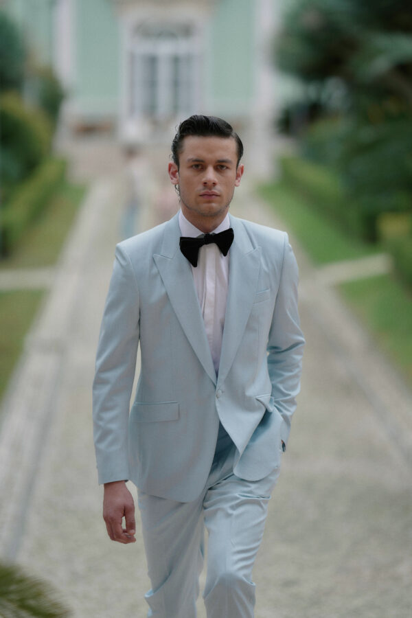 Elegante, leve e visualmente marcante, o fato Sarto combina modernidade com distinção, ideal para cerimónias em ambientes mais claros ou ao ar livre. Em azul gelo, apresenta corte Slim Fit e uma lapela em bico que alonga a silhueta com subtileza. O casaco destaca-se pelo detalhe em casa na lapela, bolso de lenço, bolsos com vivos e pala, e fecho com um botão, compondo um visual minimalista e sofisticado. Uma escolha perfeita para quem valoriza o estilo sem excessos e quer marcar presença com elegância e personalidade.