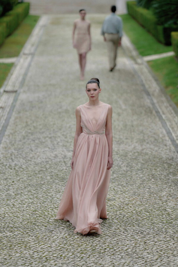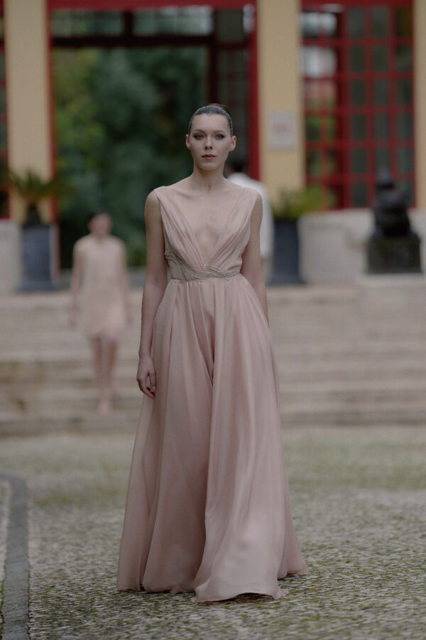 Vestido comprido confeccionado em organza leve, deslumbra com o seu drapeado trespassado no peito e a aplicação manual de pedraria na cintura, que realça subtilmente a silhueta. A sobreposição de brilhos, tanto na zona do peito como nas costas, capta a luz de forma discreta, envolta em mistério e delicadeza.