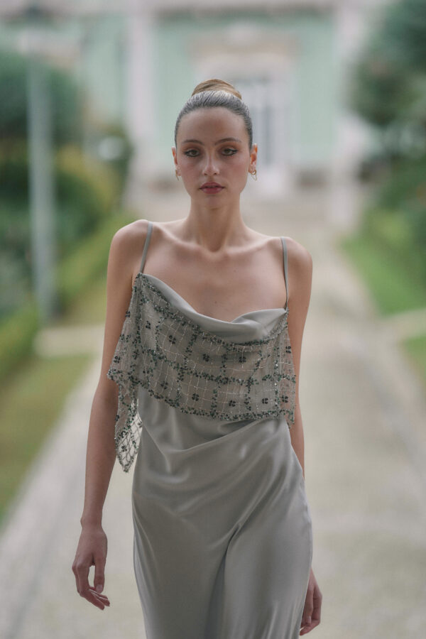 O vestido comprido Éden é a definição de sofisticação etérea. Com um corte comprido em viés e detalhe de encaixe em tecido de pedraria na zona do peito, destaca-se pelo brilho delicado e presença marcante.