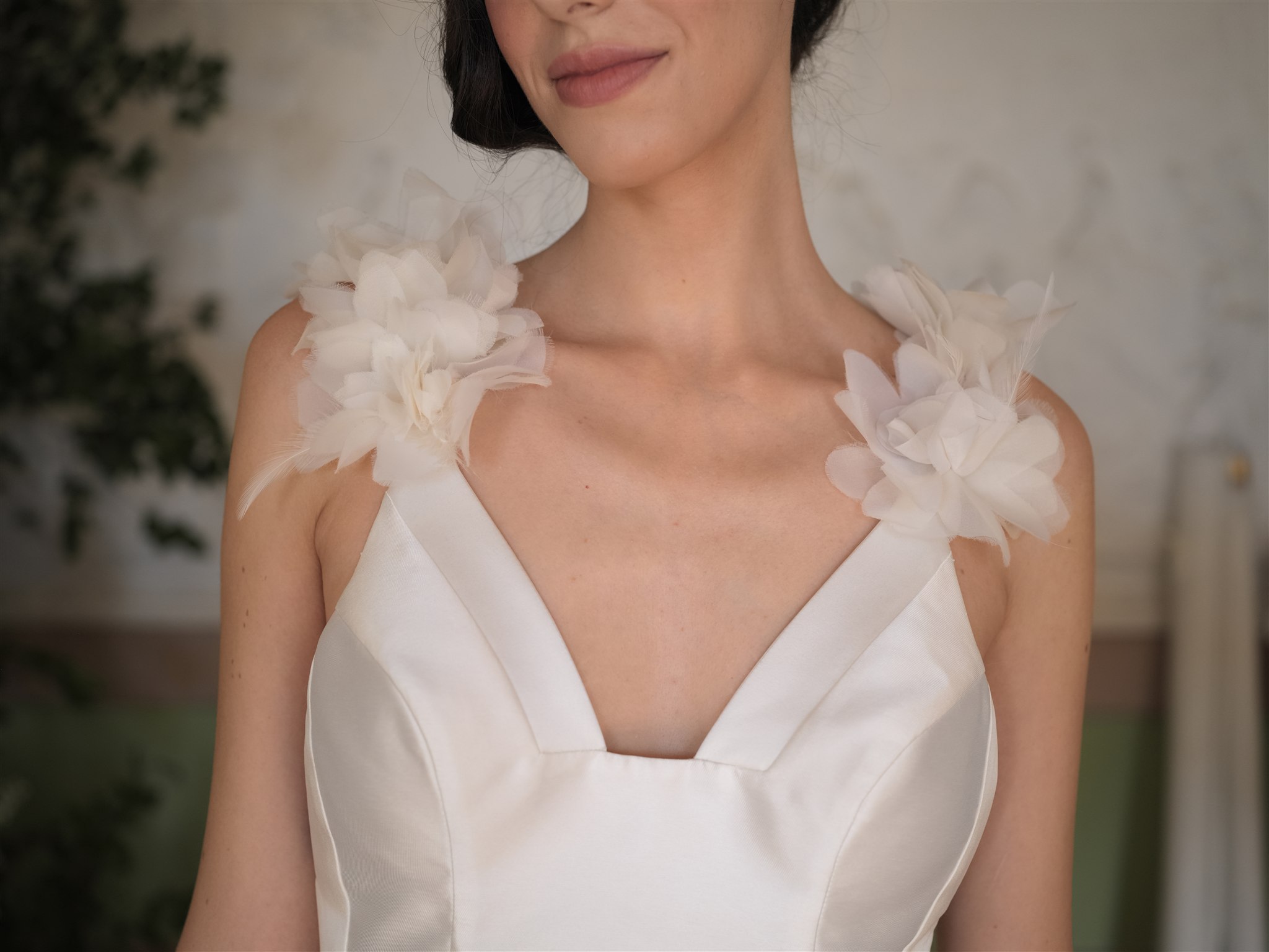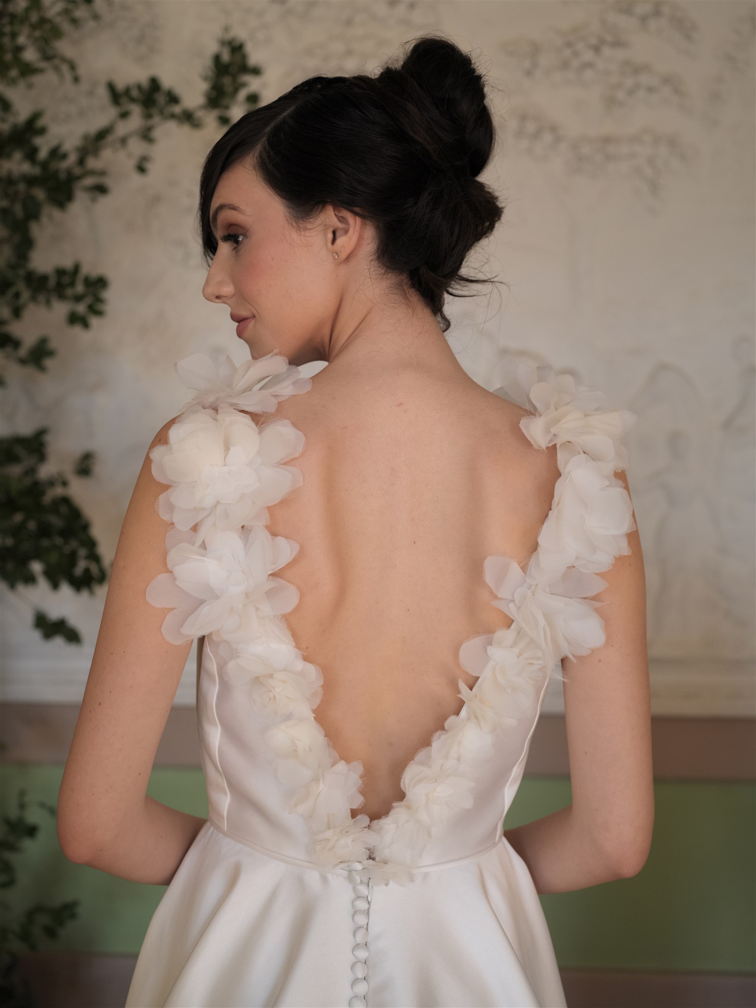 O decote é moldado por flores em organza, translúcidas e delicadas, que envolvem ombros e busto como uma moldura viva.