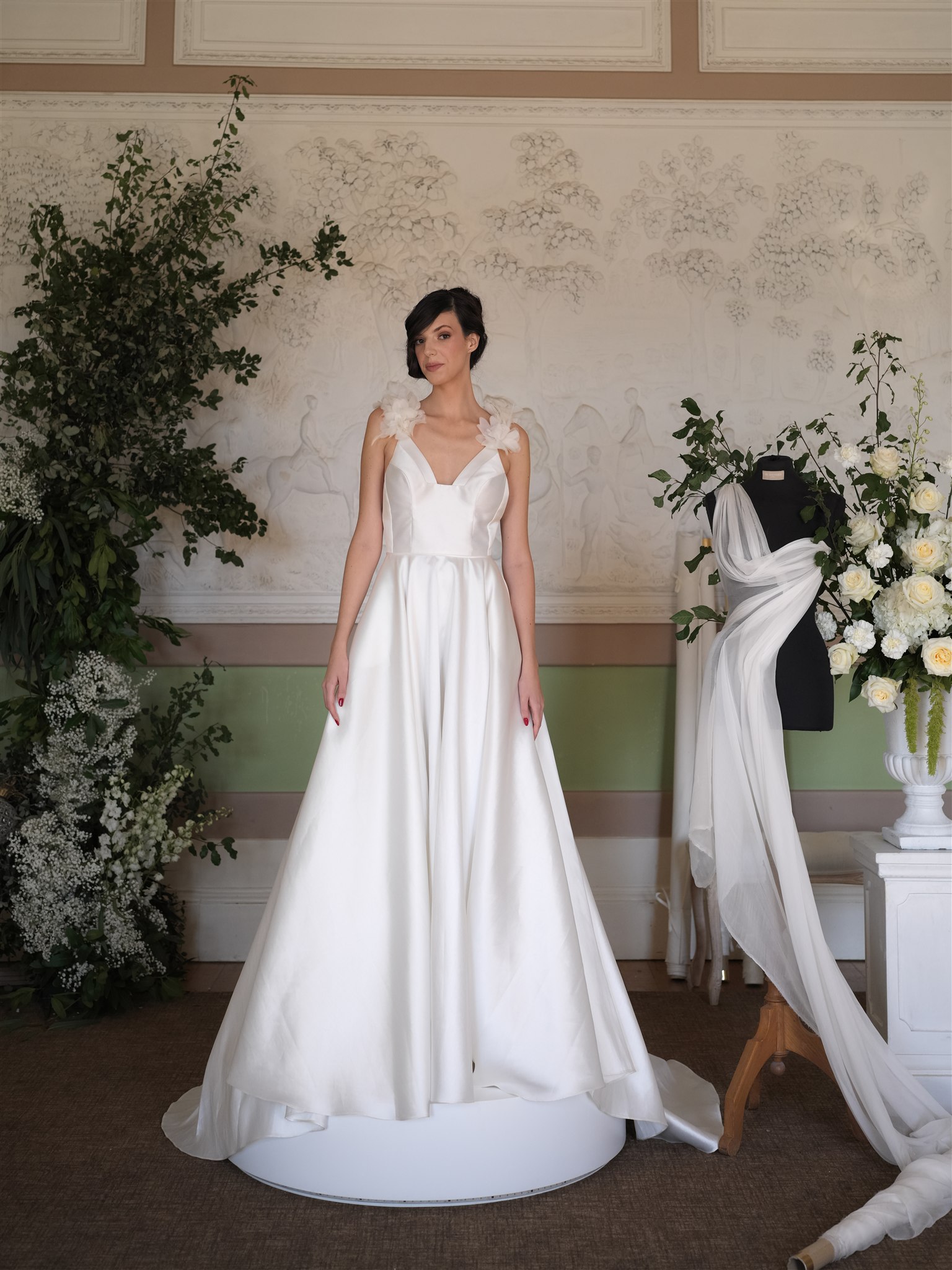 A saia A-line estruturada abre-se com uma perfeição de atelier, e escondendo bolsos: o toque moderno mais irresistível. Nas costas, o decote profundo com flores cria um momento cinematográfico.
